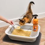 Wait until the litter box is completely dry — usually after 10–15 minutes of contact time and wiping off any residue.
