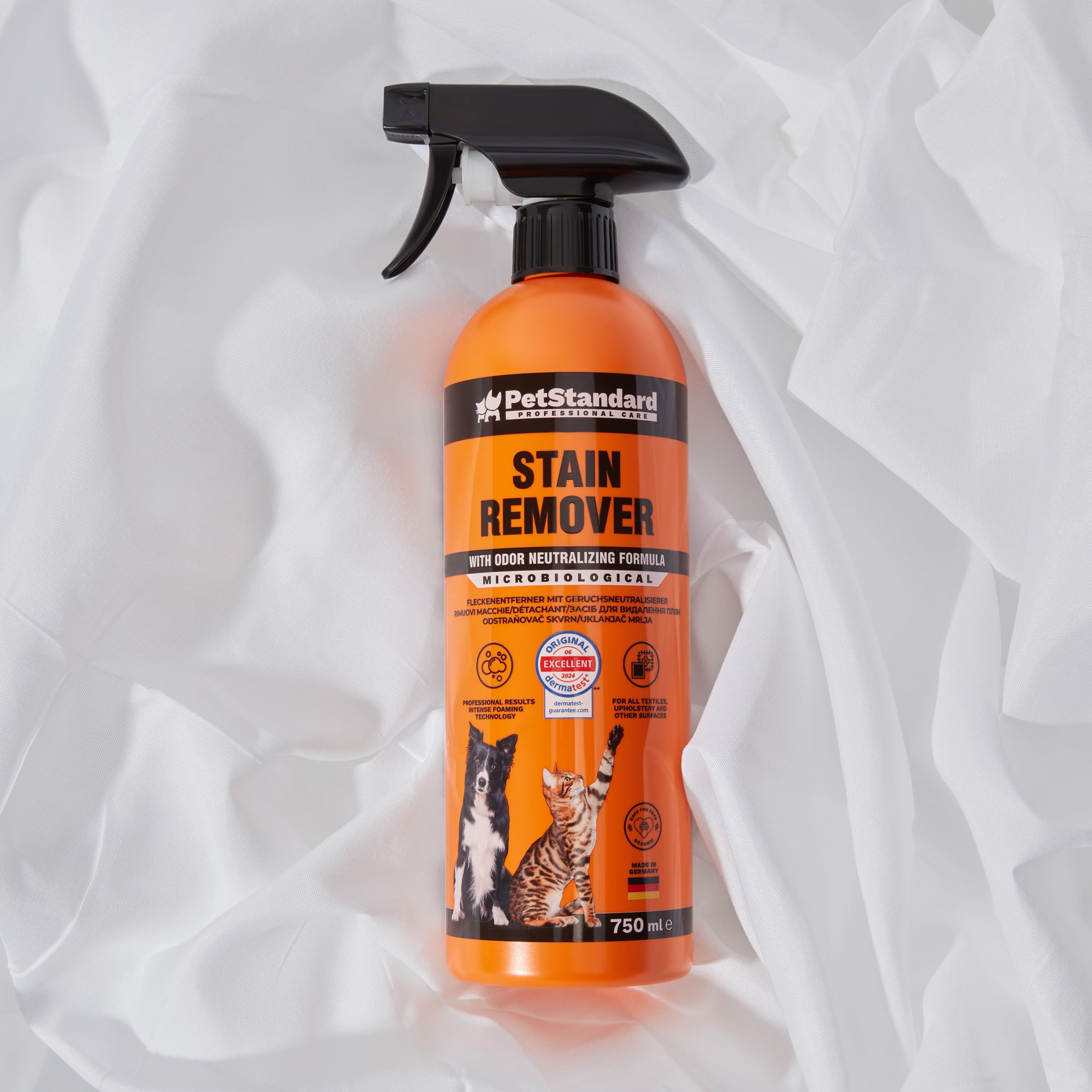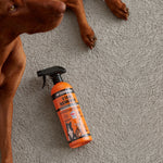 Having prepared the area for application, shake the bottle well, then spray the product generously onto the stain, slightly beyond the visible boundaries of the stain to make the area completely wet, then rub in/massage with a clean cloth and leave overnight. If the odor or stain is still present the next day, repeat the procedure.